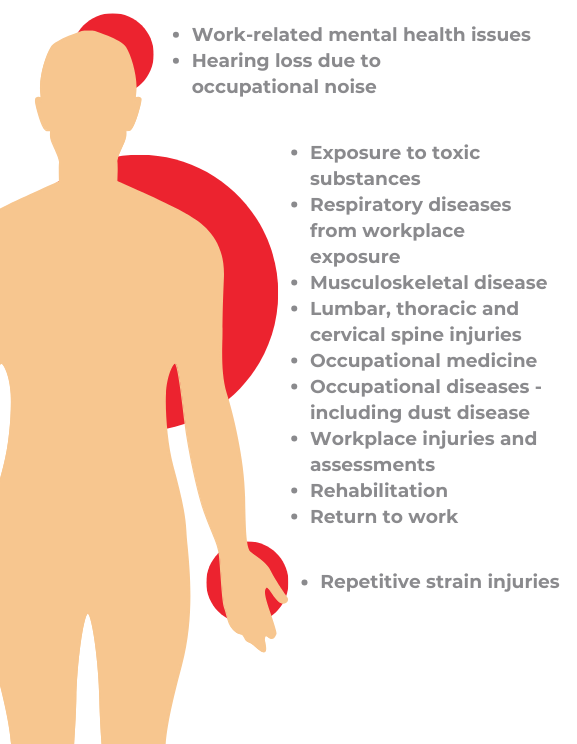Occupational and Environmental Physicians, with their extensive understanding of general and occupational medicine, can offer insights on how an injury or illness impacts an individuals ability to perform their employment. Some common conditions include: